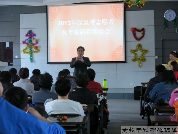 2013年2月1日下午,在我院社康部的协调下,绿丝带志愿者协会在英魁厅举办了2012年度联欢会。我院全程干预中心的程嘉主任、王涌护士长,日间康复科的王慕兰护士长以及绿丝带志愿者协会秘书长武利国出席了本次联欢会。海淀区精神康复协会的志愿者代表及全程干预中心参与个案管理服务的案主及志愿者家属也应邀参与了联欢。
