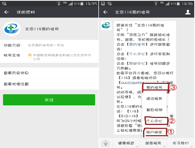 一、打开手机微信,通过扫一扫,识别“北京市预约挂号统一平台”的二维码进行关注或者通过“添加朋友”→“公众号”→“北京114预约挂号”→进行关注。