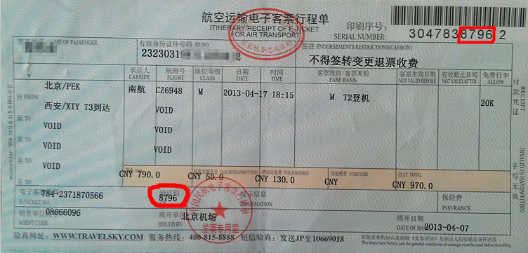飞机票真伪鉴别:飞机票下方印有“验证码”,由4位数字组成,该号码应与右上角的“印刷序号”倒数第5位至倒数第2位一致。例如: