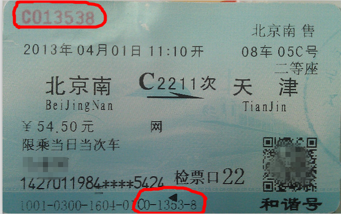 火车票左上角红色编号应与下方最后一组数字一致。例如: