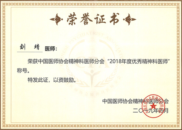热烈祝贺我院党委副书记刘靖主任医师荣获中国医师协会2018年度全国十大“优秀精神科医师”称号