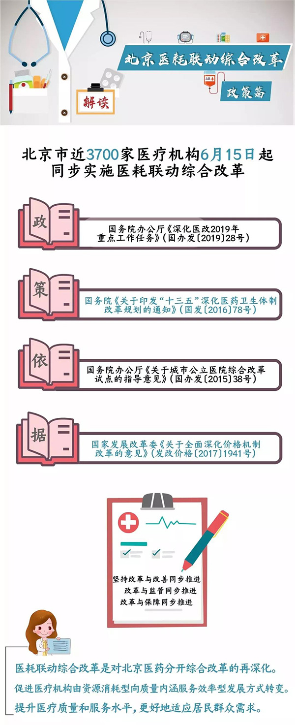 2018年12月,北京市委市政府按照党中央、国务院关于深化医改的有关要求,结合北京实际,制定发布了医耗联动综合改革政策。按照市委市政府的部署,北京医耗联动综合改革将于6月15日零时正式实施。