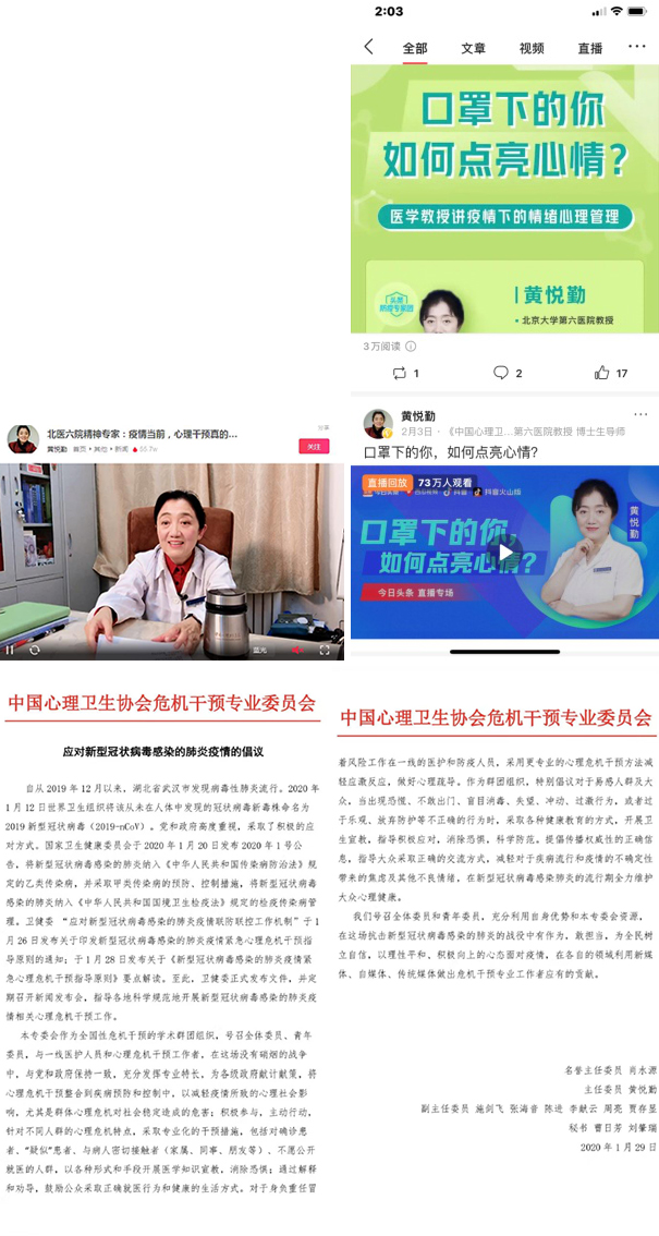 2020年2月4日,黄悦勤教授在头条、西瓜、抖音、抖音火山版同时直播了题为“口罩下的你,如何点亮心情”的公益讲座,讲述疫情下如何进行情绪管理,给出了心理疏导的建议,并详细解答了网友的提问,有超过73万的网友在线观看了直播,本次直播在网络上引起强烈反响,网友纷纷表示受益良多。“今日头条”162万的阅读量也显示了新媒体科普平台进行健康教育的巨大优势。近期,社会室联合北京地坛医院开展了针对一线医护人员、住院患者及患者家属的心理健康调查研究,以了解疫情当前医护人员及患者家属的心理健康状况及需求;另一项研究计划是联合深圳华大基因研究院针对新冠肺炎各类诊断方法的真实性评价研究,以期借助社会室团队的专业优势为疫情阻击战提供科研支持。社会室全体师生积极响应国家的号召,做好自身防护,并通过各自的社交圈积极转发各类专业的心理干预视频和文字材料,帮助大家提高疫情期间的心理应对能力。
