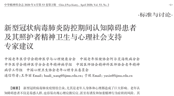 为此,记忆障碍诊疗与研究中心的专家于欣教授、王华丽教授和李涛副主任医师等结合临床经验以及疫情期间接诊与在线咨询的常见问题,带领业内同行执笔撰写《新型冠状病毒肺炎防控期间认知障碍患者及其照护者精神卫生与心理社会支持专家建议》。该建议分析了疫情期间认知障碍患者在因疑似或确诊新冠肺炎而住院、居家生活、照护机构生活等多种不同情况下的心理应激反应和病情波动原因及对策,此外,也对疫情期间照护者(家属、居家照护者、机构照护员等)可能出现的心理应激反应进行了分析,并提出了心理社会干预原则及干预方法和内容。日前该专家建议经同行审阅,已被《中华精神科杂志》接收,并在网络预发表,用于指导临床与照护实际工作。获得国内同行的一致好评,认为其具有极大的指导价值和实用性。