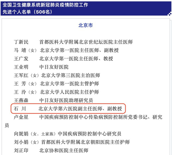 3月5日,国家卫生健康委、人力资源社会保障部、国家中医药管理局印发《关于表彰全国卫生健康系统新冠肺炎疫情防控工作先进集体和先进个人的决定》,石川医生荣获“全国卫生健康系统新冠肺炎疫情防控工作先进个人”称号。