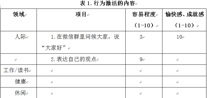 第二,监控某些特定的行为与情绪间的关系。在抑郁之前,个案每天的日常生活是如何度过的,接着再了解目前的日常生活规律,并对比两种不同生活状态下情绪有何不同,哪些事情做得太少,是不是这些事情剥夺了自己的成就感或愉快的感受,这可能是很小的事情,像打扮自己、洗碗这一类小事。有没有做过一些事情来减轻抑郁情绪,哪些事情是现在正在做,但只会带来低程度的愉快感,比如躺在床上、幻想自己过去没做好的事情等。行为激活与人际、工作/读书,健康、休闲四大领域有关,我们可以从个案很想做的一件事入手,见下面表1。譬如在人际方面,个案希望在网络上能和同学们建立一些联系,当他看到微信群里同学们在讨论事情,他希望能讲几句话,这个就可以设定为他的目标,但这个目标很模糊,我们帮助他具体化这个目标,成为向大家问候,说“大家好”,接下来分别评估容易程度和愉快感、成就感,如果分别是3分和10分,就可以看到只要个案其实付出一点点,就可以获得很高的成就感。第二个觉得更难一些的项目是“针对群里的一个话题,表达自己的观点”,假如困难程度是9,原因是他不知道如何去表达,但带来的愉快感和成就感是10,我们就知道这件事个案很期望去做,但是又很难去完成,我们可以和他一起思考该做一些怎么样的回答。我们永远是他在需要有成就感、愉快感时那只在背后帮助他的那只手,在个案大脑功能较弱时,他自己付出2分的力量,我们赋予他8分的力量,慢慢的我们一起定的项目就会变成他自己能完成的越来越多。