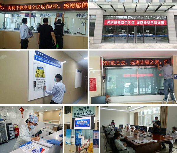 下半年以来,保卫办公室在公安部门和院领导的指导下,开展了一系列防诈骗宣传工作,特别是为预防广大住院患者受骗,开展了两次反诈骗进科室、进病房活动。日常工作中,保卫办利用北院安全督导员微信群每日发布一条防诈骗安全常识,让各位同事始终保持对诈骗的高度警惕;其次,从八月份开始保卫办加大了对全民反诈APP的推广工作,先后利用周会宣传,住院大厅条屏播放,在病房及电梯内多处张贴提示等方式增大反诈APP宣传力度;8月13日、18日保卫办人员两次现场督导职工下载全民反诈APP并告知住院患者第一时间下载注册。此外,保卫办充分利用北院门诊大厅彩屏、门诊一层和二层各个条屏滚动播放防诈骗知识并张贴各类防范网络电信诈骗宣教海报,努力做到广而告之群防群治。