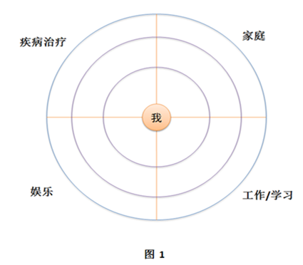 图中间代表案主本人,以“我”为中心依次划分为三个圆,分成四个领域,分别是疾病治疗、家庭、工作/学习、娱乐,可就每一个领域进行深入探讨,写下生活中对自己来说有重要作用和意义的人、物品、运动、爱好、情感等,或是任何一种形式的与自身有关、对自己有帮助的事情,都可以称为生活中的个体资源。