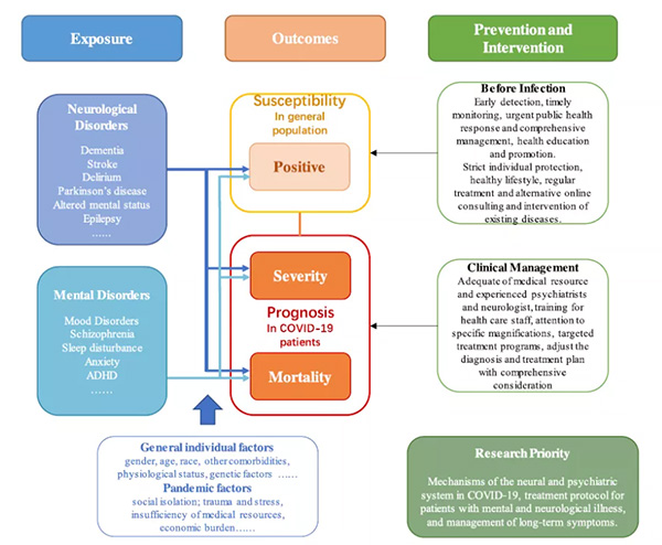 研究发现,在新冠感染前,患有神经精神疾病的人群会增加感染新冠肺炎的风险,精神疾病人群相比于普通人群,感染新冠的风险增加67%,而痴呆等神经疾病患者相比于普通人群感染新冠的风险增加1倍。在新冠感染后,无论是既往曾经诊断为神经精神疾病的人群还是感染后新出现的神经精神症状的新冠患者,其发展成为新冠肺炎严重病例和死亡风险都显著增加。进一步的亚组分析显示,生活在中低收入地区的患者、在新冠肺炎病程中出现继发精神障碍的患者其更易发展成为严重病例,患有神经精神障碍的年轻患者发生死亡的风险高于老年患者。对于不同的神经精神疾病而言,情绪障碍、焦虑、注意缺陷多动障碍和痴呆会增加新冠肺炎感染的易感性,而情绪障碍、睡眠障碍以及病程中出现谵妄或精神状态改变会加重疾病的严重程度,精神分裂症和中风、痴呆等多种神经疾病则和死亡率升高关联密切。