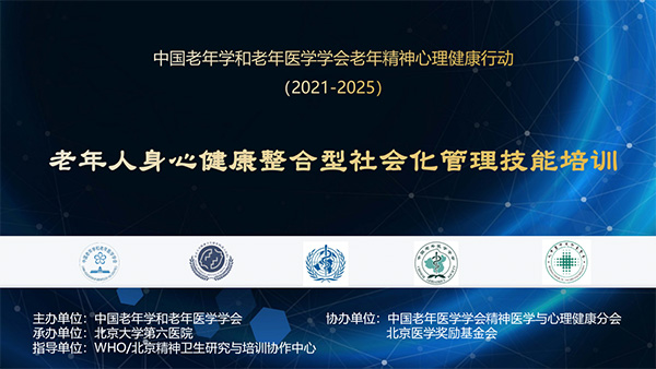 2021年,中国老年学和老年医学学会在全国范围内组织开展《老年健康促进行动(2021-2025年)》专项活动,《老年精神心理健康行动》获得首批成功立项,我院王华丽教授担任行动项目负责人。为推进该项目的顺利实施,由中国老年学和老年医学学会主办,中国老年医学学会精神医学与心理健康分会、北京医学奖励基金会协办,WHO/北京精神卫生研究与培训协作中心指导,我院承办的“老年人身心健康整合型社会化管理技能”首期培训班于2021年12月11日-12日成功举办。