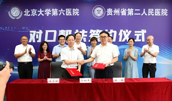 2016年底,原国家卫生计生委、贵州省人民政府签署了《关于共同推进贵州医疗卫生事业改革发展的战略合作协议》,贵州省第二人民医院作为受援单位之一,与我院结成“一对一”帮扶关系,并签署了为期5年的对口支援项目协议。5年来,我院在人才培养、学科建设、管理能力建设等方面给予了贵州省第二人民医院极大帮助,先后选派7名专家到院驻点帮扶,安排14名专家定期到贵州开展诊疗教学工作,接收24名医护人员到北京进修学习,帮助组建了省内首个睡眠医学专科、儿童青少年心理专科,指导建立了省内首家成瘾医学中心和压力管理中心,填补了贵州省精神专科细分领域多个空白。帮扶期间,贵州省第二人民医院获批国家级住院医师规范化培训基地,主持参与国家自然科学基金项目,贵州省级、市厅级科研项目60余项。得益于北大六院的倾情相授、尽心相助,贵州省第二人民医院医教研工作全面提升,省级精神卫生中心地位进一步巩固,对带动全省精神医疗服务水平提升,实现医疗服务同质化有着重要意义。