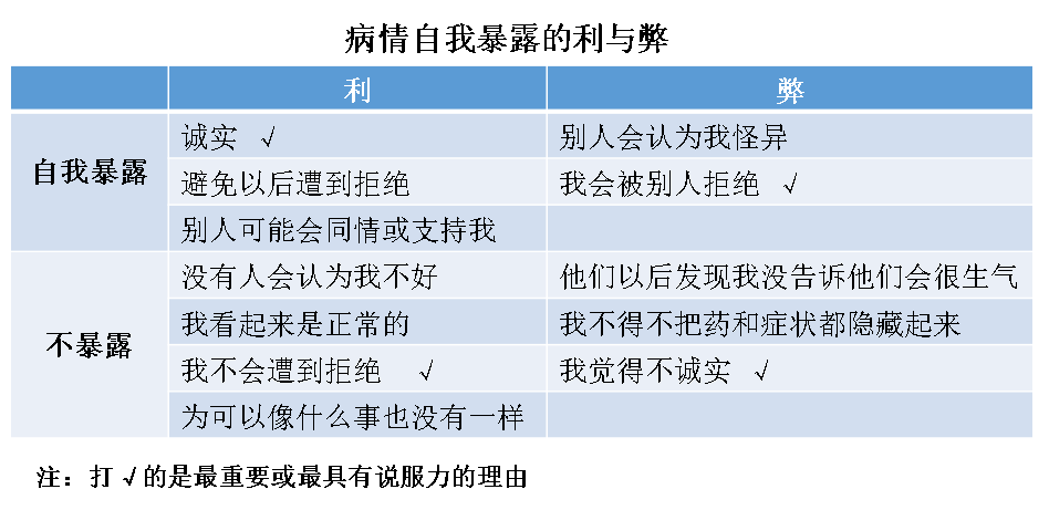 从上表的例子中看出,这位案主认为自己暴露的主要利处是诚实,防止在以后遭到拒绝,主要的不利因素也是受到别人拒绝。当头脑中有了这些认识后,发现案主希望维持人际关系且保持内心的诚实,可以尝试找到一些折中的办法,比如关于病情,可以只说自己想说的那一部分,委婉告诉对方自己曾有有过这样一段经历,通过积极治疗和调整已经恢复了,得到对方的理解和支持。在决定正式告知他人病情之前,可以尝试通过角色扮演的方式,与家人一起练习如何合适地表达。