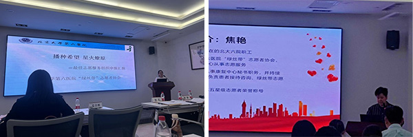 10月27日下午3点,首都学雷锋志愿服务“五个100”先进典型活动初评会在北京大学人民医院综合行政楼召开。我院精神疾病康复中心“绿丝带”志愿者协会和社工焦艳分别入围参加首都最佳志愿服务组织、首都最美志愿者两个项目的评选。申报者按顺序进行现场阐述,焦艳社工向在座评委介绍了自己的康复经历和志愿人生,于玲老师代表 “绿丝带”志愿者协会进行了工作介绍,两位老师的报告精彩而令人感动。会上有来自各医疗行业的志愿者和志愿组织,大家进行了深入交流,气氛热烈,为我院志愿服务和社工工作的开展提供了很多借鉴。