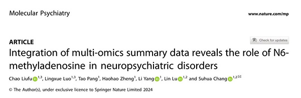 1. Chao Liufu#, Lingxue Luo#, Tao Pang, Haohao Zheng, Li Yang, Lin Lu, Suhua Chang*. Integration of multi-omics summary data reveals the role of N6-methyladenosine in neuropsychiatric disorders. Molecular Psychiatry, 2024 Apr 29. doi: 10.1038/s41380-024-02574-w.