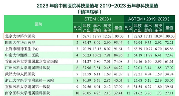 我院荣获2023年度中国医院科技量值暨2019-2023五年总科技量值精神病学学科第一