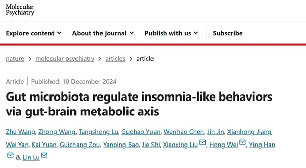2024年12月10日,北京大学第六医院、IDG麦戈文脑科学研究所、北大-清华生命科学联合中心陆林团队,在Molecular Psychiatry杂志发表题为“Gut microbiota regulate insomnia-like behaviors via gut-brain metabolic axis”的文章,团队发现了肠道微生物群的缺失可以改变睡眠行为。微生物代谢物丁酸盐可通过调节小鼠下丘脑外侧区食欲素神经元的活性来促进睡眠。口服丁酸酯可缓解小鼠的睡眠障碍。总的来说,这些发现揭示了微生物代谢途径在调节失眠样行为中的作用,为治疗睡眠障碍提供了潜在的治疗策略。